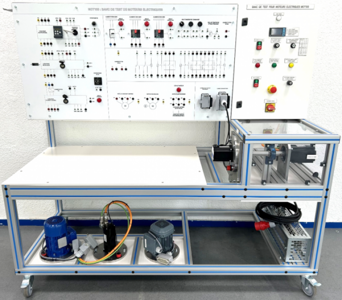 The principle of the bench is to study and characterize the behavior of 4 different types of electric motors (asynchronous, synchronous, brushless and direct current), to study their control modes and associated protections